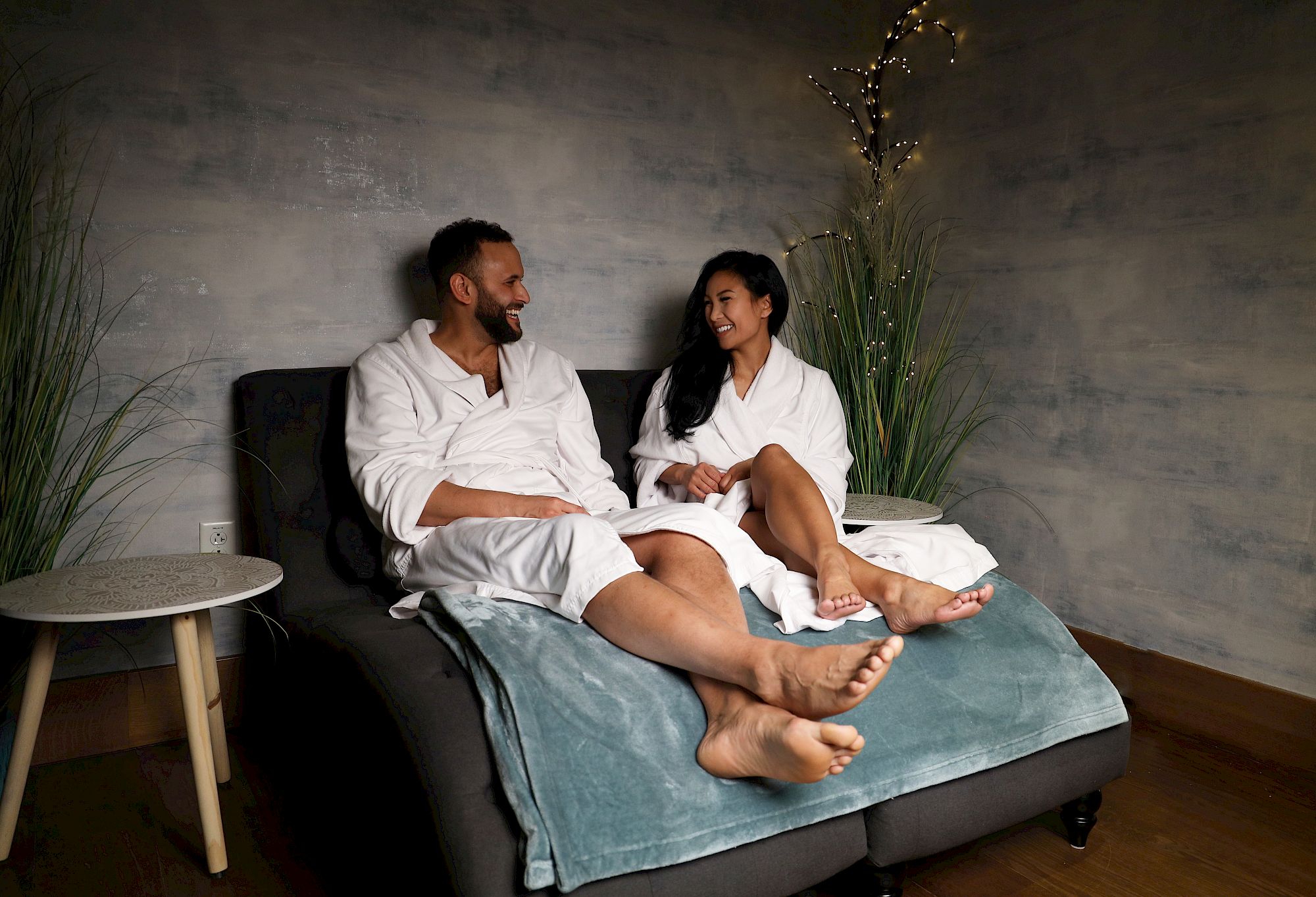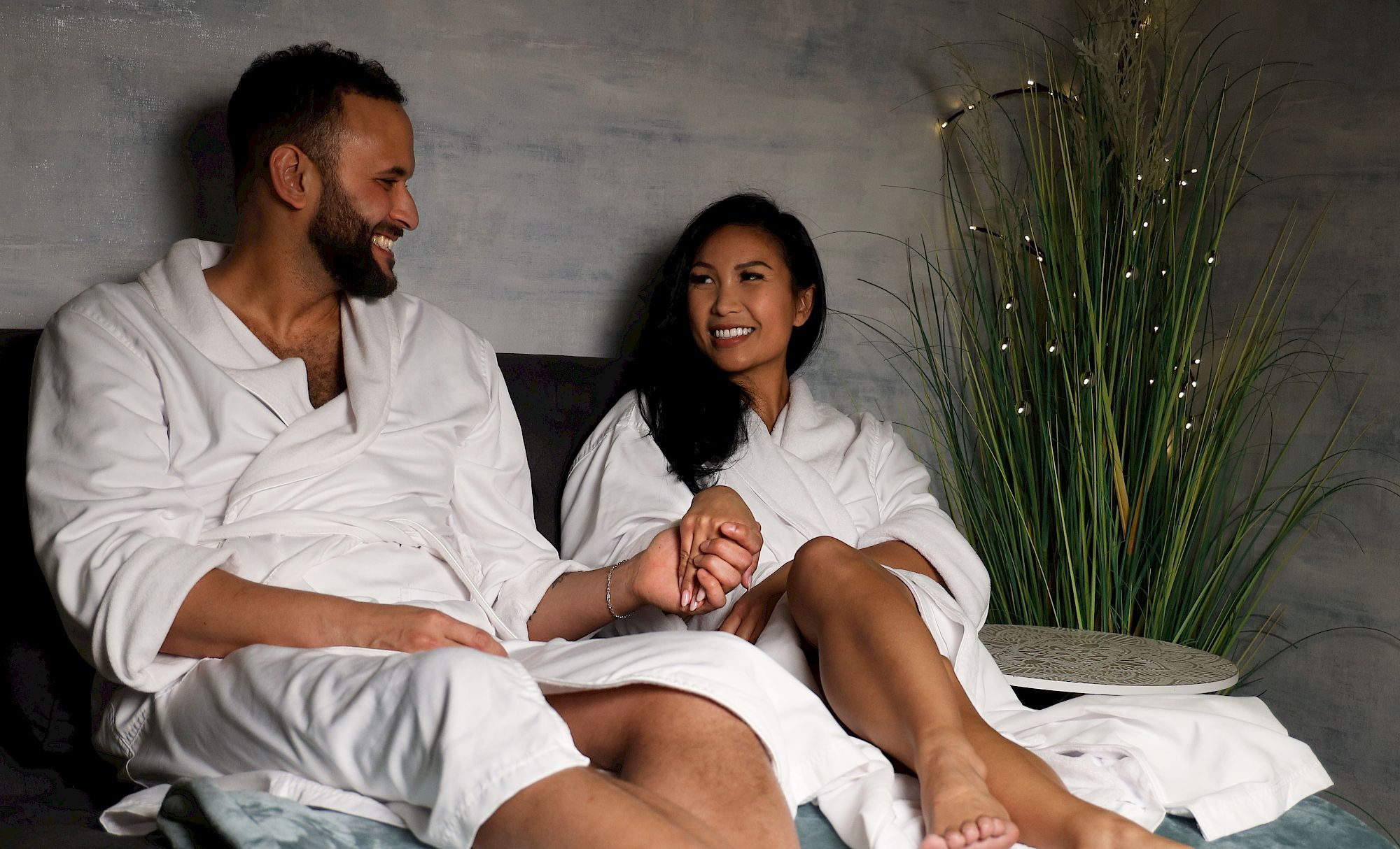 Two people in white robes sitting on a couch, smiling and holding hands in a spa-like setting.