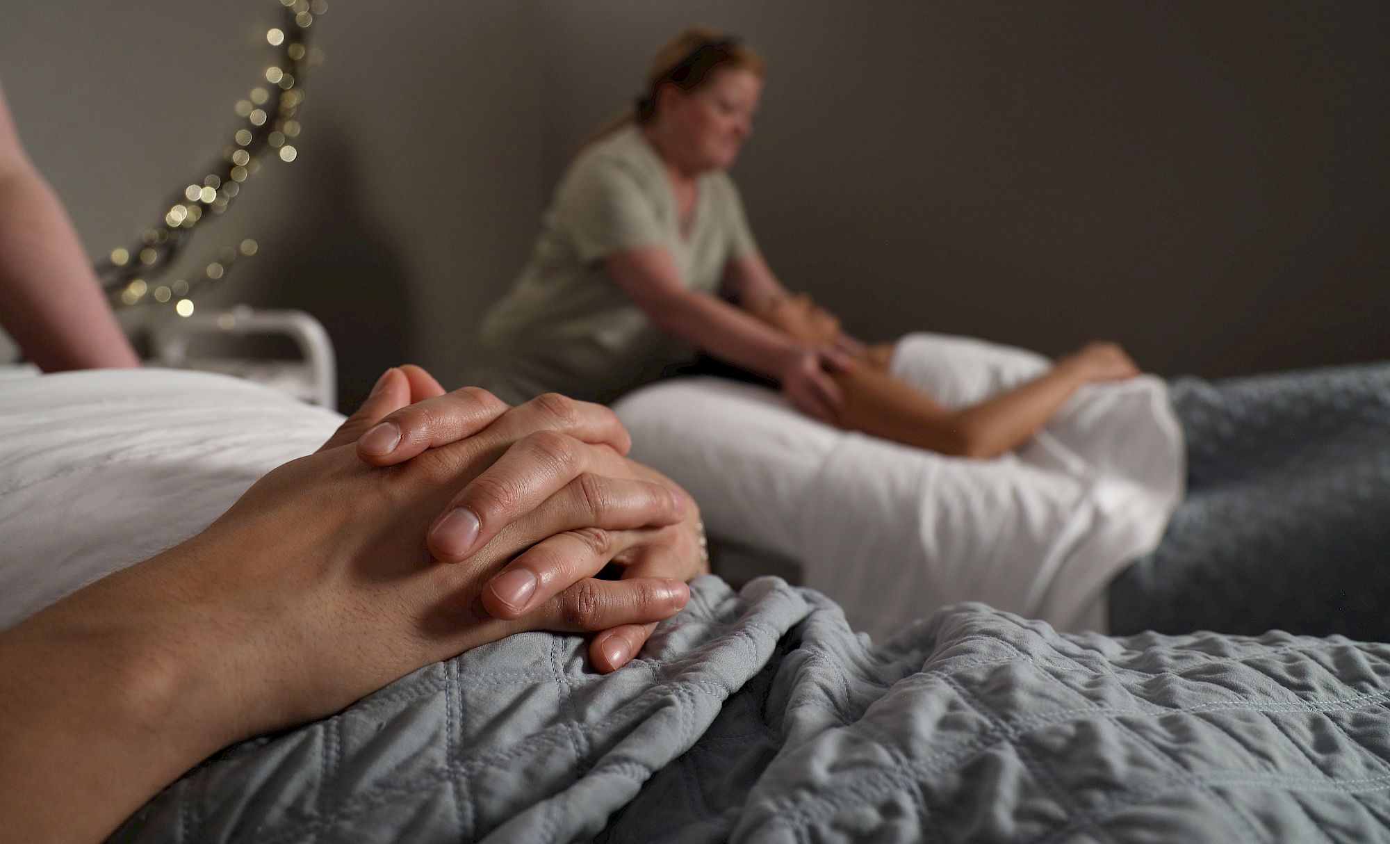 Two people hold hands in a cozy, dimly lit room, with someone receiving a massage in the background, set beside soft blankets and lights.