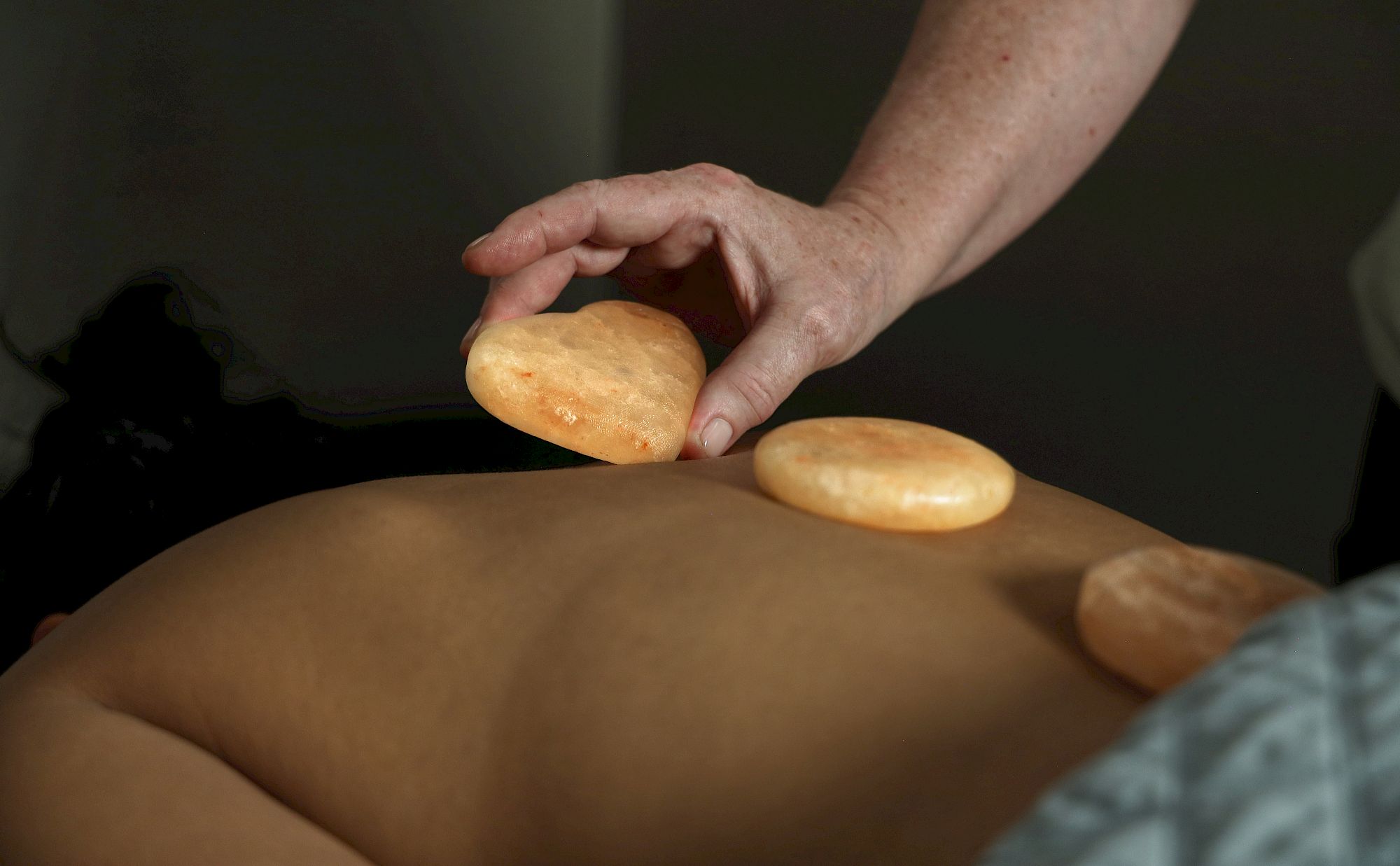 Two smooth stones resting on a bare back, blurred person lying on a bed in the background.