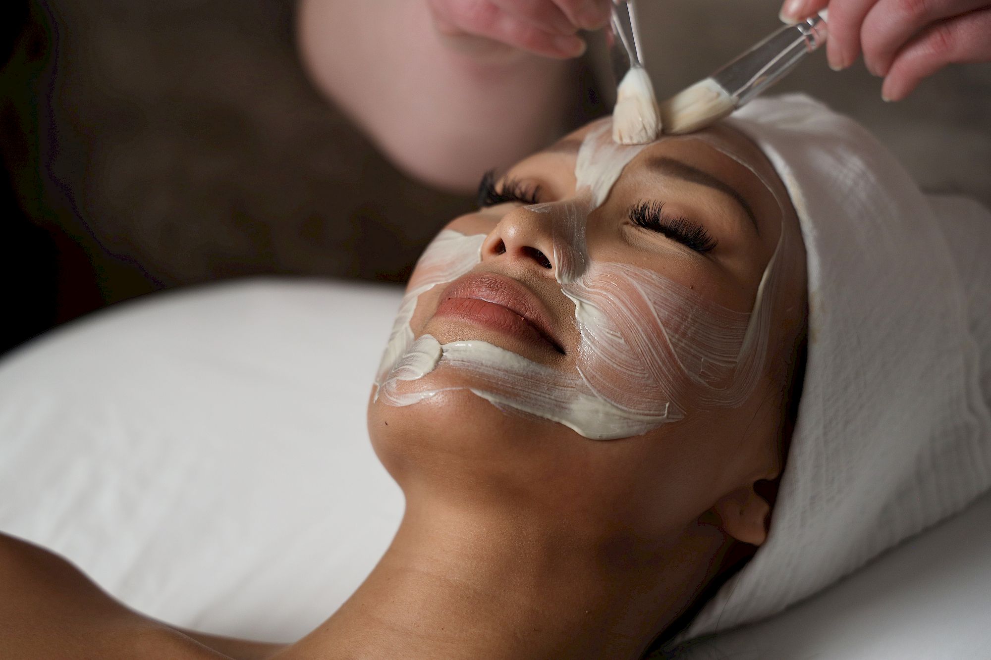 A person wearing a white facial mask reclines with a towel on a spa bed, while another dressed in white tends to them.