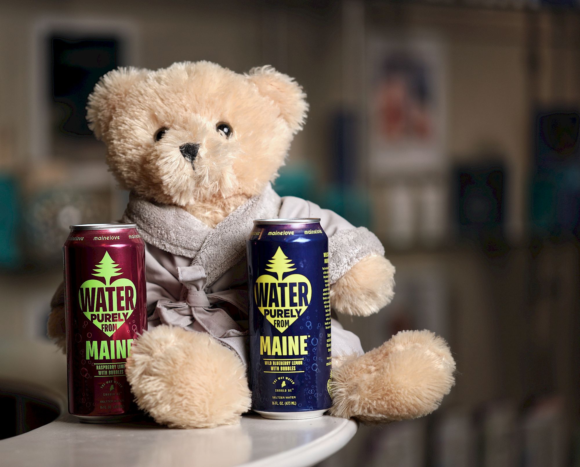 Two stuffed bears sit on a table with two cans of Maine Water Purity drink beside them.