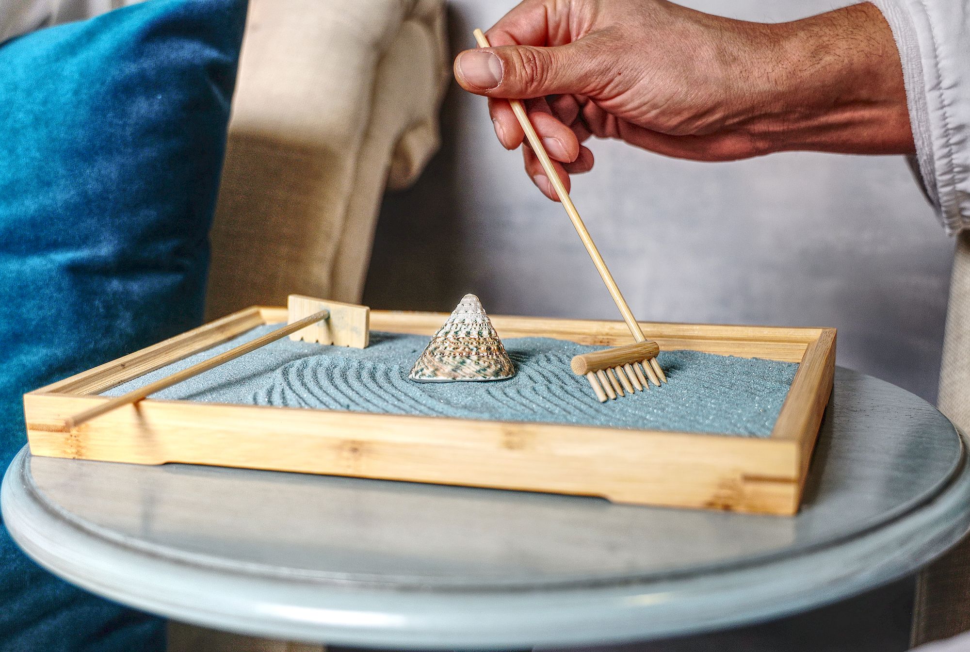 A wooden sand tray with a small cone, a tiny rake, and a raked pattern; a hand uses a stick to move the sand.